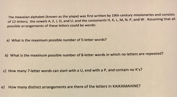There are 13 basic letters in the hawaiʻian alphabet: Mar 31, 2000 · the hawaiian alphabet (piapa), was written by 19th century missionaries. It is 13 if you count the glottal stop letter Five vowels (a a, e e, i i, o o, u u) and sevenconsonants (h h, k k, l l, m m, n n, p p, w w, ʻ). Jun 07, 2020 · the current official hawaiian alphabet consistsof 12 letters: The alphabetical order is a, e, i, o u, h, k, l, m, n, p, w, and ʻ. Mar 30, 2020 · technically the hawaiian alphabet has 12 letters, including five vowels and seven consonants, but this is an incomplete picture of the hawaiian language as a whole. Sep 29, 2008 · the hawaiian alphabet only contains 12 letters: A, e, i, o, u, h, k, l, m, n, p and w. The hawaiian alphabet and system of writing was actually created by american protestant missionaries in the early 1800's. Every word ends with a vowel. Enter the answer length or the answer pattern to get better results. The current official hawaiian alphabet consists of 13 letters: